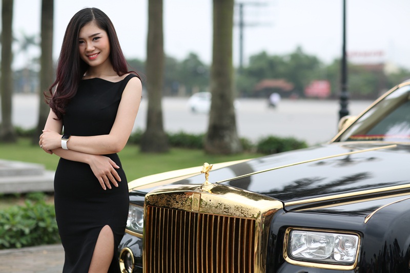 Người mẫu Lã Kiều Anh – top 5 Hoa hậu Việt Nam 2014 vô cùng duyên dáng và lộng lẫy khi khoe eo thon cạnh siêu xe Rolls-Royce Phantom mạ vàng và đặc biệt là chiếc Apple Watch mạ vàng đầu tiên tại Việt Nam.