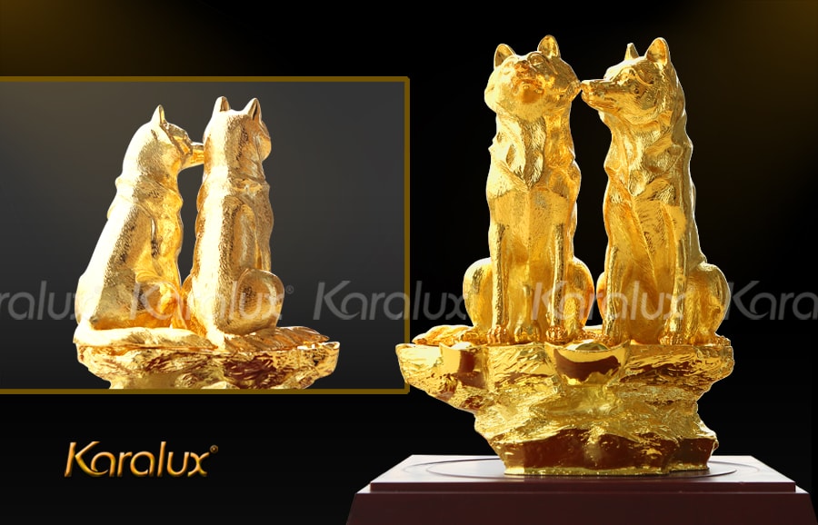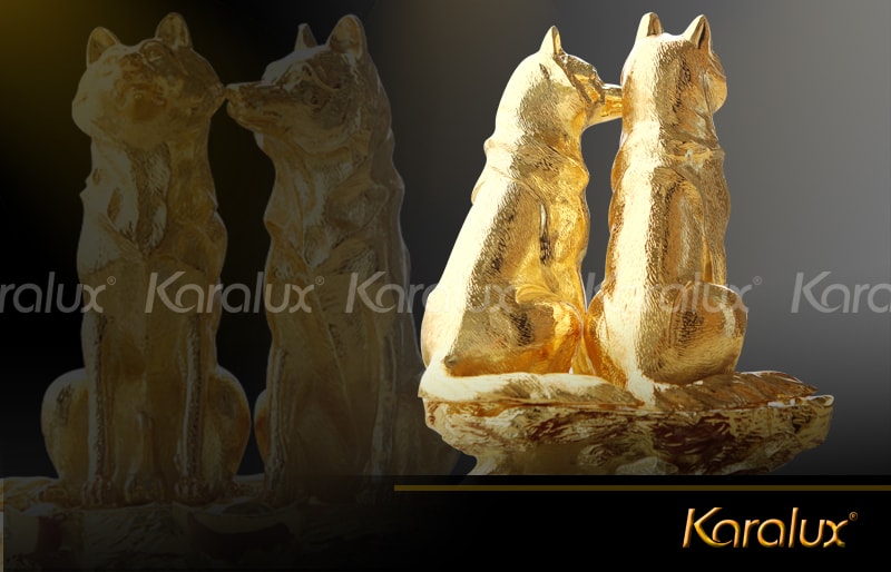 Tượng Song Khuyển Tài Lộc được đúc nguyên khối từ chất liệu đồng phủ vàng ròng, với hình ảnh cặp đôi chó đứng trên núi tiền hoặc núi vàng tùy theo sở thích và chọn lựa của quý khách. Bằng đôi bàn tay tài hoa dày dạn kinh nghiệm cùng sự tỉ mỉ, chuyên tâm trong chế tác, đội ngũ thợ thủ công của Karalux đã thổi hồn cho những tảng đồng khô khan trở thành bức tượng bộ đôi tượng chó phong thủy mạ vàng với những chi tiết, đường nét vô cùng sắc sảo, mượt mà vô cùng ấn tượng.